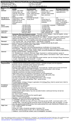 We have provided a ONE PAGE PA State Law Study Guide for your use in preparing for the exam. While we cannot know exactly what will be on the State Test, we have included everything that we could find and put it in one place. We also have a ONE PAGE INDUSTRY KNOWLEDGE GUIDE and ONE PAGE FEDERAL LAW GUIDE on our free training site. (Free, but registration is required.) Pennsylvania Mortgage Firms and Employee Supervision One of the clauses in the Mortgage Act specifically referenced that the DOB will hold companies responsible for the actions of their employees. You must report self-discovered illegal or prohibited activities, and the action you have taken to correct the activities, to the DOB within 30 days of discovery. If you do not have written policies and procedures describing your operations, how personnel must comply, and the steps that each employee must take to correctly perform his or her job, you are exposing your company to regulatory action. Protect your firm with a Production Quality Control Plan. SAFE Act - Crimes and Punishment One of the stated goals of the SAFE Act was to make sure that people who didn't meet basic standards of fitness - in character or financial responsibility - would be ineligible for licensure. While individual states had the ability to make discretionary decisions in the past, the federal law prohibits certain individuals from obtaining licensure: